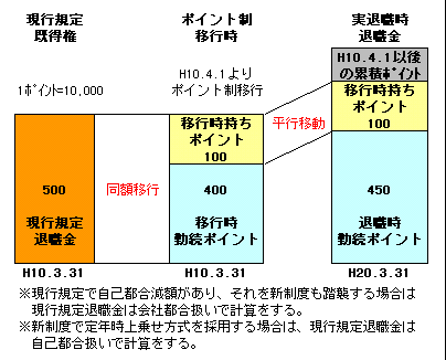さて、ポイント制に切り替える場合は具体的には次の手段をとります。旧規定からの移行にあたっては、移行時現在の既得権を「既得権ポイント」として各人別に算出し、今後はそのポイントに役職(職能等級)ポイント等を加算します。