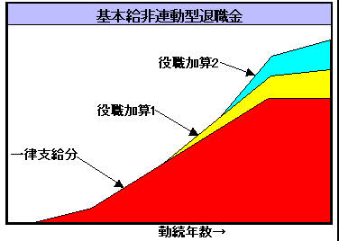 現在、本給連動方式で退職金を運用している場合は、賃金制度の改定とともに退職金や賞与の算定方式を変更する必要があります。この場合すでに運用している退職金制度を改定すると「既得権」の問題が生じます。退職金制度の変更は明らかに労働条件の変更に当たるため、不利益変更は原則としてできません。つまり従前の退職金支給の基準を乗せ替え時点において下回ることはできないのです。しかし、基本給連動型の退職金とはいっても、将来の確定した額を約束している訳ではないので、今後の方向については労使協議のうえでの改定は可能です。それともう一つの既得権があります。それは現状で算定基礎となる賃金が凍結されたと仮定し、現在の規定による係数をそれに乗じて計算された退職金た金額です。これが将来の退職時点で旧規定の方が有利となる場合(特に定年間近の人が該当することが多い)がありますので、これも既得権として保証する必要が出てきます。(我々はこの二つを絶対既得権と論理既得権と呼んでいます。)この対策策として、5年程度を移行措置期間とし、新旧の規定のどちらか多い方を支給するという方法も考えられますが、基本給が大幅に変更された場合は、算定基礎となる賃金の換算措置を設ける必要があります。例えば「今後5年間の旧規定における退職金の計算にあたっては、「本給の80%をその対象とする」等の規定を設けておきます。この措置を設定しないと、基本給の大幅アップにともない退職金支給額が跳ね上がってしまいます。