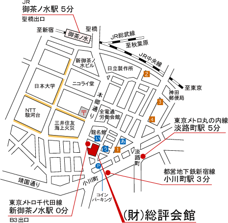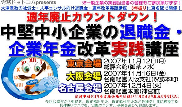 日 時 平成19年11月12日(月)午前10時から午後4時30分講 師 株式会社名南経営 人事コンサルタント 大津章敬 会 場 総評会館 201会議室(東京・御茶ノ水) 東京都千代田区神田駿河台3-2-11(TEL 03-3253-1771) □地下鉄 東京メトロ千代田線 新御茶ノ水駅 B3出口(徒歩0分) 東京メトロ丸ノ内線 淡路町駅 B3出口(B3出口まで徒歩5分) 都営地下鉄新宿線 小川町駅 B3出口(B3出口まで徒歩3分) ※B3a出口は、違う方向へ出ますのでご注意ください。 □JR 中央線・総武線 御茶ノ水駅 聖橋口(徒歩5分) 受講料 30,000円(税込) 対 象 社労士・人事コンサルタントなど専門家のみなさま、人事担当者など退職金・適年制度改定の実務に携わるみなさま 定 員 |