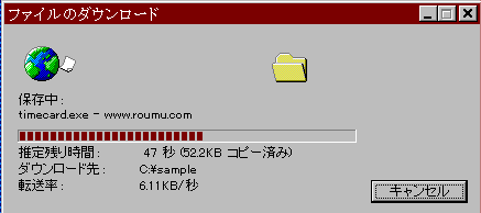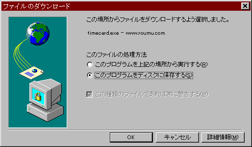 ここではroumu.comで配布しているフリーソフトのダウンロード方法について、「タイムカード集計システム」を例に挙げご説明します。なお、ここではブラウザとしてMicrosoft Internet Explorerを使用しています。 | 1)「roumu.com」へ接続する ここをクリックして「roumu.com」のトップページを開いて下さい。 2)「Excelで使える人事総務ソフト集」をクリック ホームページのメニューの中から「Excelで使える人事総務ソフト集」をクリックします。 3)「Excelで使える人事総務ソフト集」の中からダウンロードしたいソフト名をクリック 「Excelで使える人事総務ソフト集」にはroumu.comで配布されている各種ソフトの一覧が表示されています。その中からダウンロードしたいソフト名をクリックして下さい。ここでは「タイムカード集計システム」をクリックします。 4)「ダウンロード」のファイル名「timecard1_01.exe」をクリック 3)の操作により接続されたページ(タイムカード集計システム)には「タイムカード集計システム」に関する説明が書かれています。その中の「ダウンロード」の記述の中にあるタイムカード集計システムソフトのファイル名「timecard1_01.exe」をクリックすると、自動的にソフトのダウンロードが開始されます。 5)「このプログラムをディスクに保存する(S)」を選んで「OKボタン」をクリック 4)の操作を行うと自動的にファイルのダウンロードが開始され、以下のウィンドウが開きます。 ![]() そこには「このプログラムを上記の場所から実行する(R)」と「このプログラムをディスクに保存する(S)」という2つの処理方法が選択できるようになっていますので、後者の「このプログラムをディスクに保存する(S)」を選んで「OKボタン」をクリックして下さい。これによりダウンロードしているファイルをお使いのパソコンのハードディスクに保存する処理が開始されます。 6)ファイルを保存する場所を選択し、保存を行う 5)の操作を行うと「ファイル名をつけて保存」というウィンドウが開きますので、このファイルを保存するフォルダを選択し、「保存ボタン」を押して下さい。 ![]() 7)ファイルのダウンロード 5の操作を行うとウィンドウ「ファイルのダウンロード」が開き、ダウンロードが行われ、しばらくするとダウンロードが完了します。 ![]() 一覧へもどる Meinan Management Consulting Network All Rights Reserved |