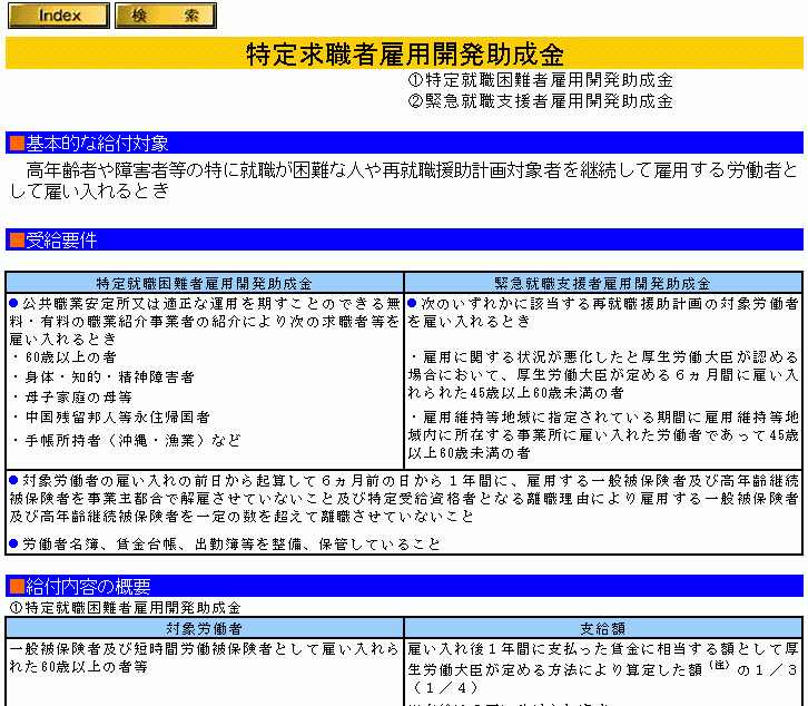現在の景気低迷の長期化、また今後の高齢化や女性の社会進出、産業構造の転換や技術革新が急速に進む状況の中で労働省を中心として、事業主に対する雇用維持・支援等の為の助成金の充実が図られています。しかしこれらは何れも事業主の自己申請により支給され、また一般的にどの様な助成金があるのかが知られていない為にせっかくのチャンスを逃してはいないでしょうか。