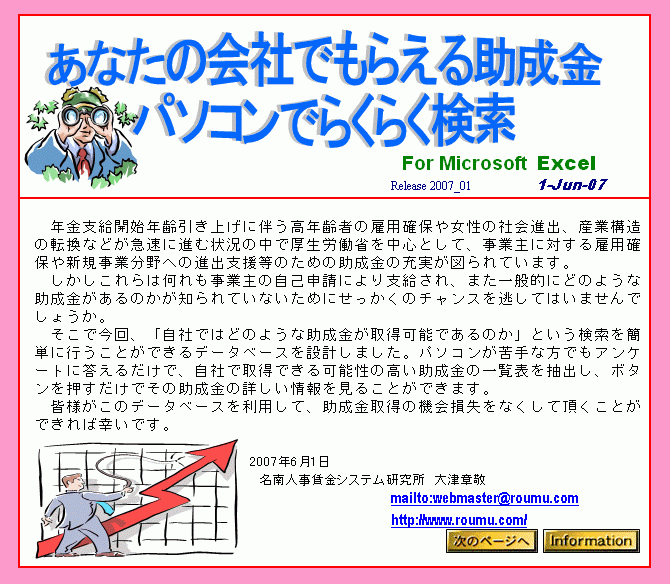 労務ドットコムで紹介している各種ソフトウェアは基本的にフリーウェアとなっていますが、この助成金検索ソフトは有料での販売となっております。当ソフトのお申し込みは以下のフォームに必要事項をご入力の上、申込ボタンを押してください。折り返し商品を代金引換にてお送りさせて頂きます。なおお問い合わせはwebmaster@roumu.comもしくは電話で052-683-7539(担当:大津)までお願いします。