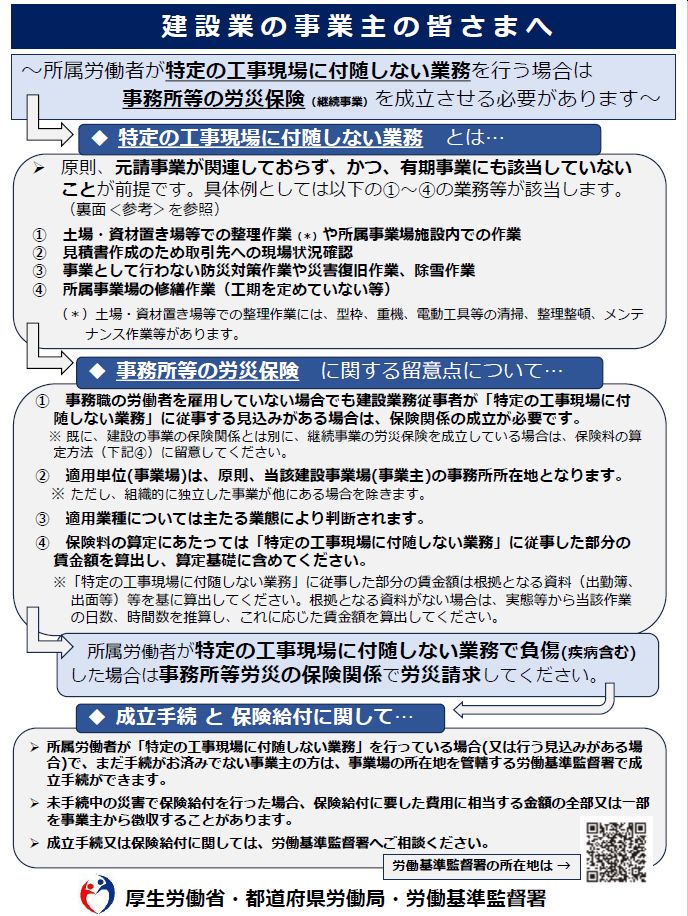 タイトル:建設業の事業主の皆さまへ~所属労働者が特定の工事現場に付随しない業務を行う場合は事務所等の労災保険(継続事業)を成立させる必要があります~