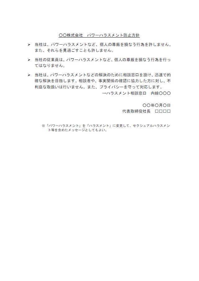 ○○株式会社 パワーハラスメント防止方針(トップからのメッセージ)