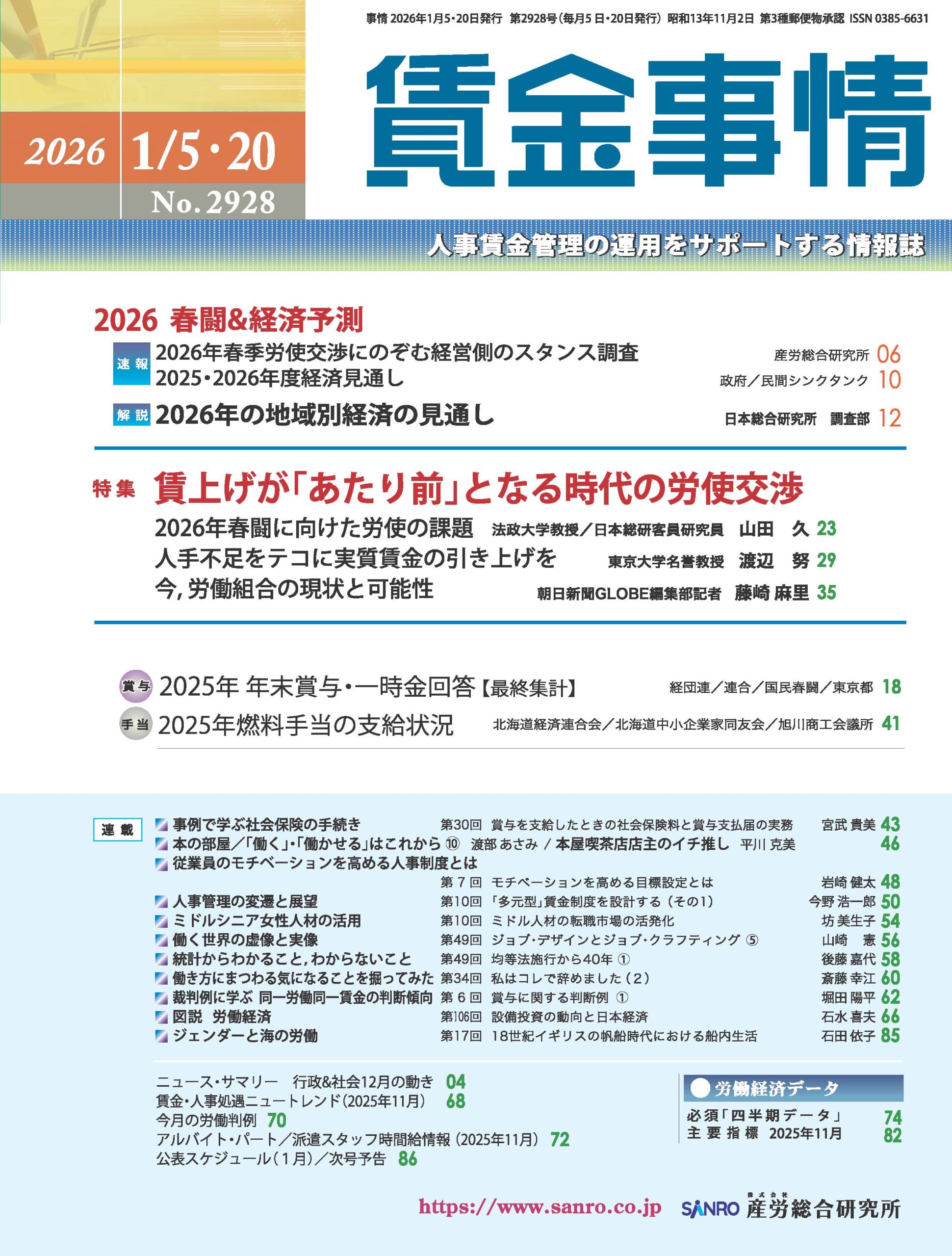 弊社特定社会保険労務士の宮武貴美が「事例で学ぶ社会保険の手続き」のタイトルで連載を行っている「賃金事情」の2026年1月5日・2026年1月20日合併号 が発売されました。