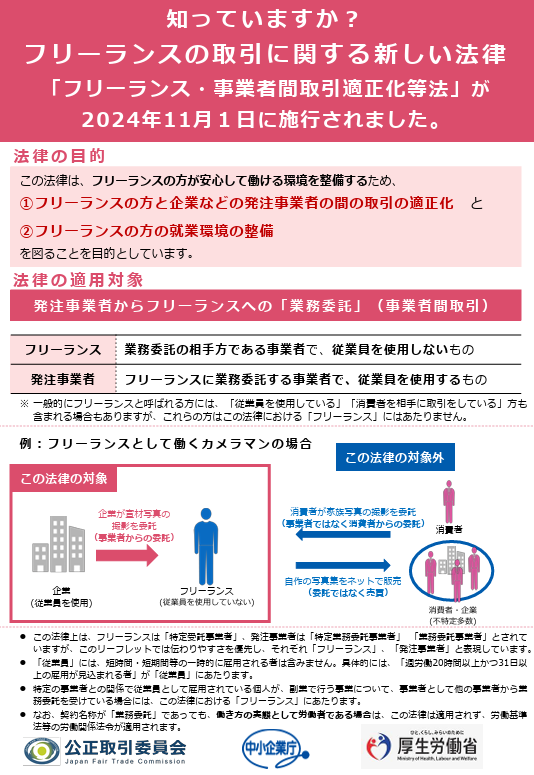 タイトル:知っていますか?フリーランスの取引に関する新しい法律「フリーランス・事業者間取引適正化等法」が2024年11月1日に施行されました。