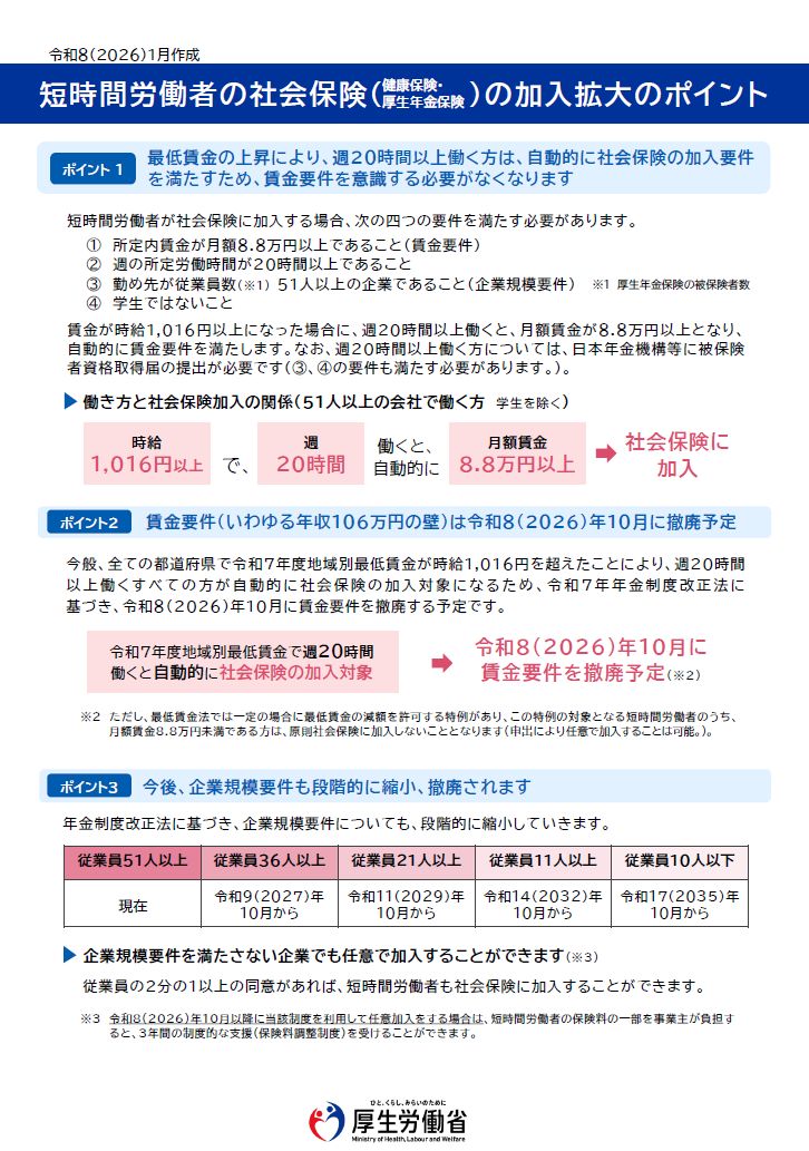 概要:このリーフレットは、短時間労働者の社会保険加入拡大について、賃金要件や企業規模要件などの加入条件と制度改正のポイントを整理した周知資料である。最低賃金上昇を踏まえた実務上の留意点を分かりやすく示している。