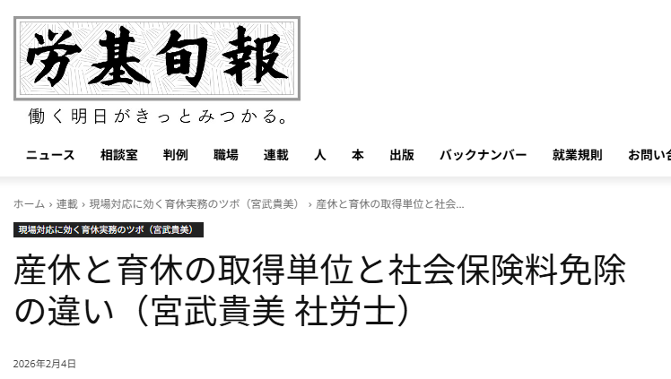 労基旬報」にて特定社会保険労務士の宮武貴美が「現場対応に効く育休実務のツボ」のタイトルで連載を行っています。今回、以下の最新記事が公開されました。