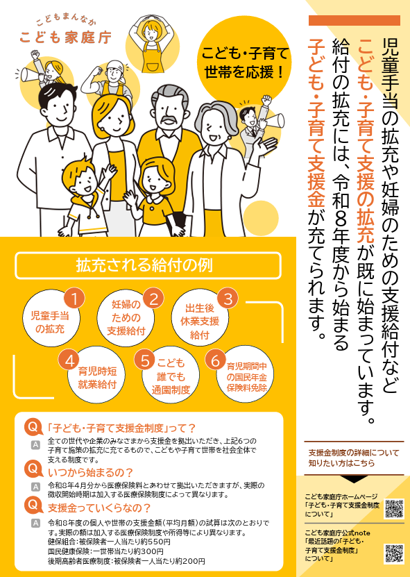 概要:このポスターは子ども・子育て支援の拡充策として、令和8年度から導入される「子ども・子育て支援金制度」の概要を紹介している。少子化対策を目的に、児童手当や育児支援給付の拡大を進め、社会全体で子育てを支える仕組みを説明している。