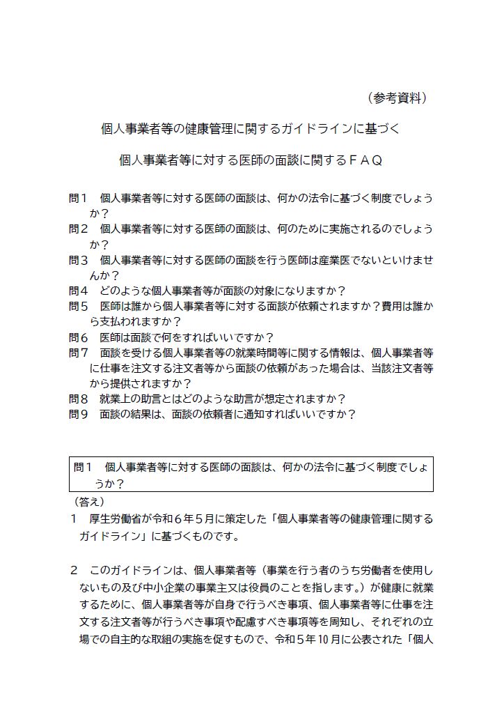 タイトル:個人事業者等の健康管理に関するガイドラインに基づく個人事業者等に対する医師の面談に関するFAQ