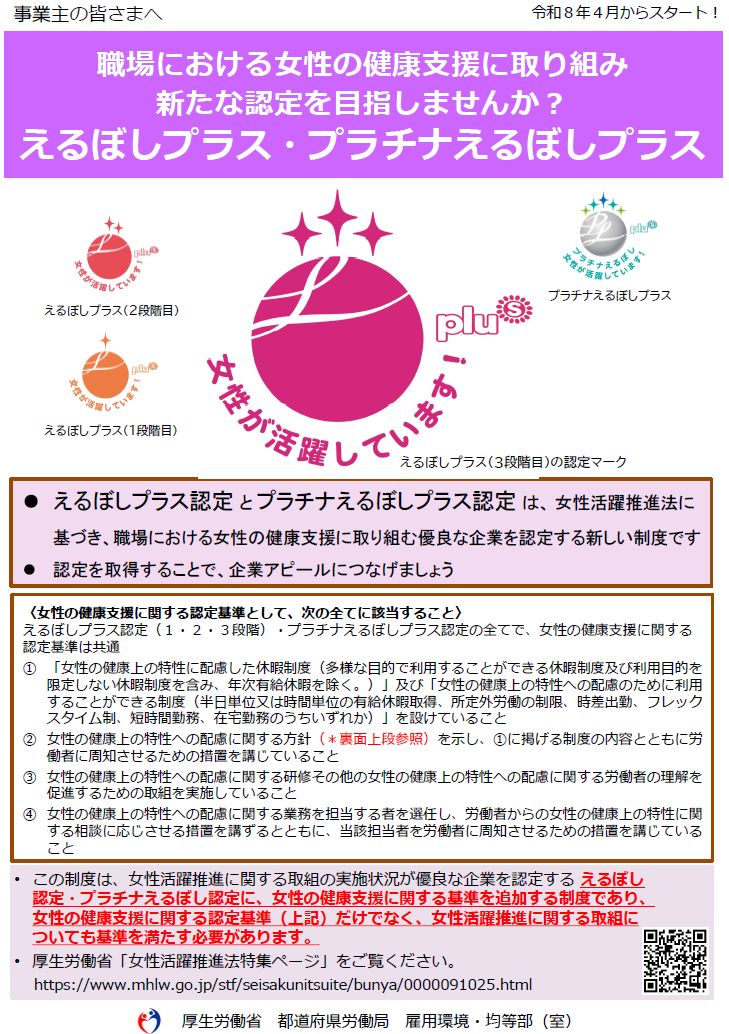 事業主の皆さまへ 職場における女性の健康支援に取り組み新たな認定を目指しませんか? えるぼしプラス・プラチナえるぼしプラス