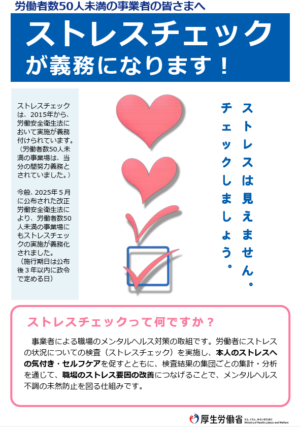 タイトル:労働者数50人未満の事業者の皆さまへ ストレスチェックが義務になります!