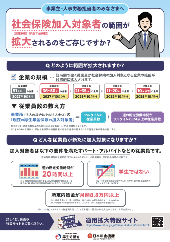 タイトル:事業主・人事労務担当者のみなさまへ 社会保険加入対象者拡大の範囲がされるのをご存じですか?(チラシ版)