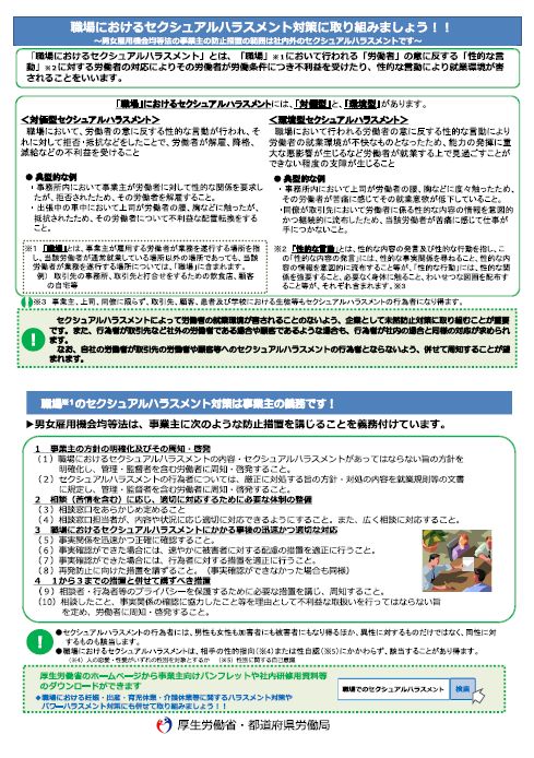 概要:職場におけるセクハラ対策について、簡潔にまとめたリーフレット。