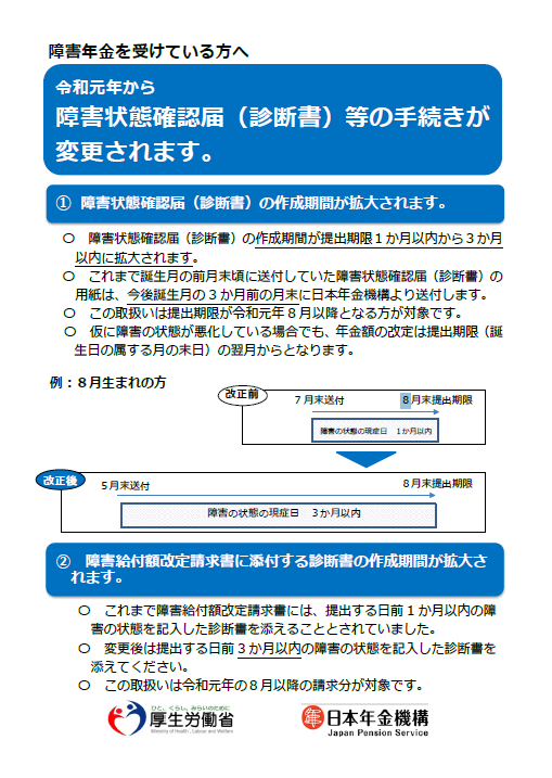 概要:障害年金受給者が提出する障害状態確認届(診断書)について、発送時期、診断書の作成期間及び20歳前障害基礎年金の所得審査の方法等が、令和元年7月以降、順次変更となることをお知らせしたリーフレット。