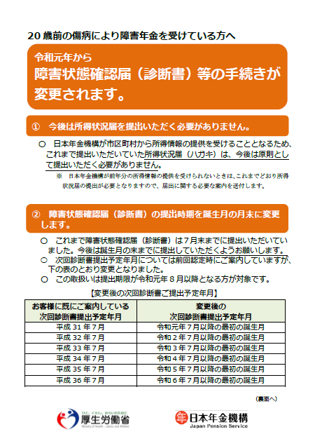 nlb0676タイトル:20 歳前の傷病により障害年金を受けている方へ 令和元年から障害状態確認届(診断書)等の手続きが変更されます。