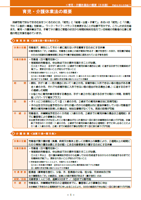 概要:育児・介護休業法の概要について簡単に説明したリーフレット。
