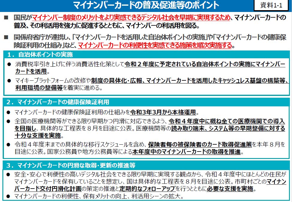 ・令和4年度末までの具体的な移行スケジュールを含め、保険者毎の被保険者のカード取得促進策を本年8月を目途に公表。国家公務員や地方公務員等による本年度中のマイナンバーカードの取得を推進。