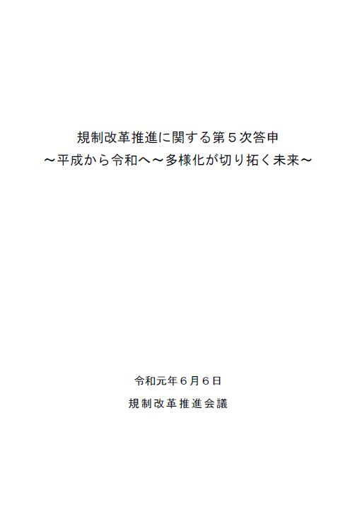 実際に、内閣府では規制改革推進会議が設置され、今期の検討体制として、行政手続部会、農林ワーキング・グループ、水産ワーキング・グループ、医療・介護ワーキング・グループ、保育・雇用ワーキング・グループ、投資等ワーキング・グループに分けて審議が行われてきました。そして、約1年をかけて取り組まれてきた規制改革項目について、第5次答申「規制改革推進に関する第5次答申~平成から令和へ~多様化が切り拓く未来~」として、審議の結果が取りまとめられたものが公開されました。