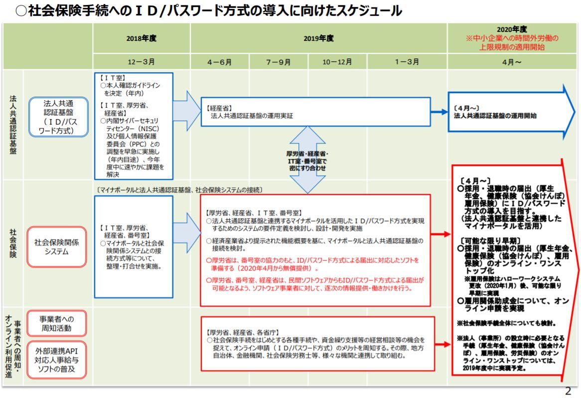 行政手続きコスト削減の取り組みが着々と動いています。中小企業庁は2019年6月12日に開催した第9回中小企業・小規模事業者の長時間労働是正・生産性向上と人材確保に関するワーキンググループの中で、社会保険手続へのID/パスワード方式の導入に向けたスケジュールを公表しました。