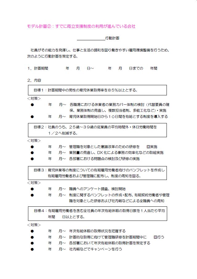 これは、柔軟な働き方を活用して仕事・キャリア形成と育児の両立を支援するために、会社がどのような取組を行うのかをまとめるためのものです。「育児に係る柔軟な働き方支援プラン」策定マニュアルの中でとり上げられている書式で、この […]