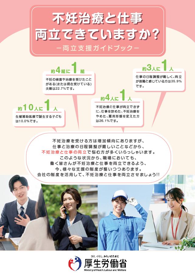 タイトル:不妊治療と仕事両立できていますか? 発行者:厚生労働省 発行時期:2024年9月 ページ数:4ページ 概要:このリーフレットは、不妊治療と仕事の両立を支援する制度や企業の取り組みを紹介している。不妊治療の現状、 […]