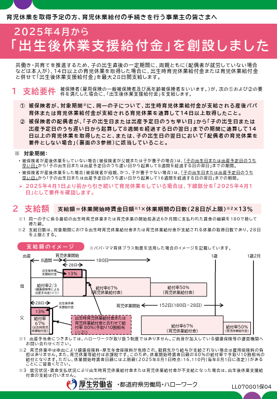 タイトル:教えて!出生後休業支援給付金の話 制度利用ガイド(パパ編) 発行者:厚生労働省 発行時期:2025年12月 ページ数:10ページ 概要:このリーフレットは、共働き・共育てをする夫婦を支援する「出生後休業支援給付 […]