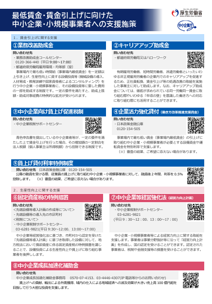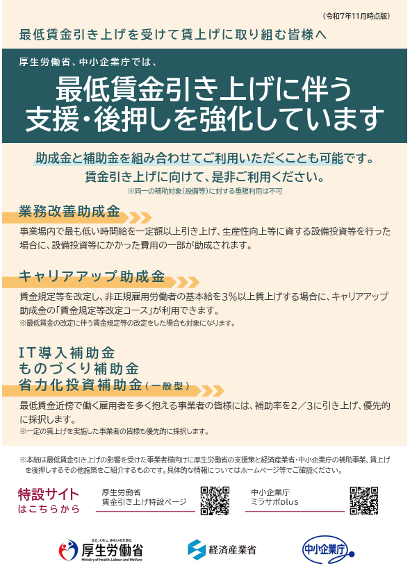タイトル:厚生労働省、中小企業庁では、最低賃金引き上げに伴う支援・後押しを強化しています 発行者:経済産業省 発行時期:2025年11月 ページ数:6ページ 概要:このリーフレットは、最低賃金引き上げに伴う中小企業事業者 […]