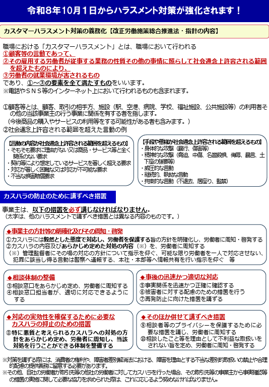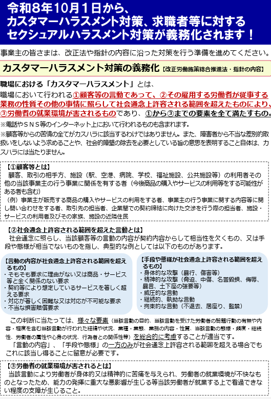 タイトル:令和8年10月1日から、カスタマーハラスメント対策、求職者等に対するセクシュアルハラスメント対策が義務化されます! 発行者:厚生労働省 発行時期:2026年2月 ページ数:6ページ 概要:カスハラと求職者へのセ […]