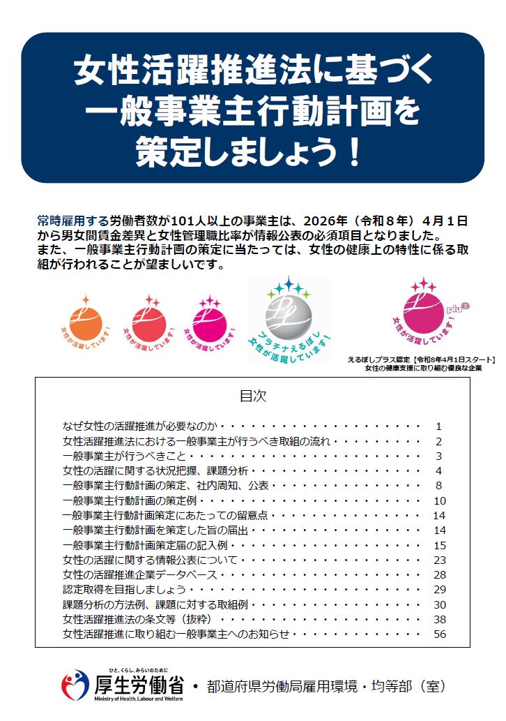 タイトル:女性活躍推進法に基づく一般事業主行動計画を策定しましょう!(2026年3月版) 発行者:厚生労働省・都道府県労働局雇用環境・均等部(室) 発行時期:2026年3月 ページ数:58ページ 概要:このリーフレットは […]