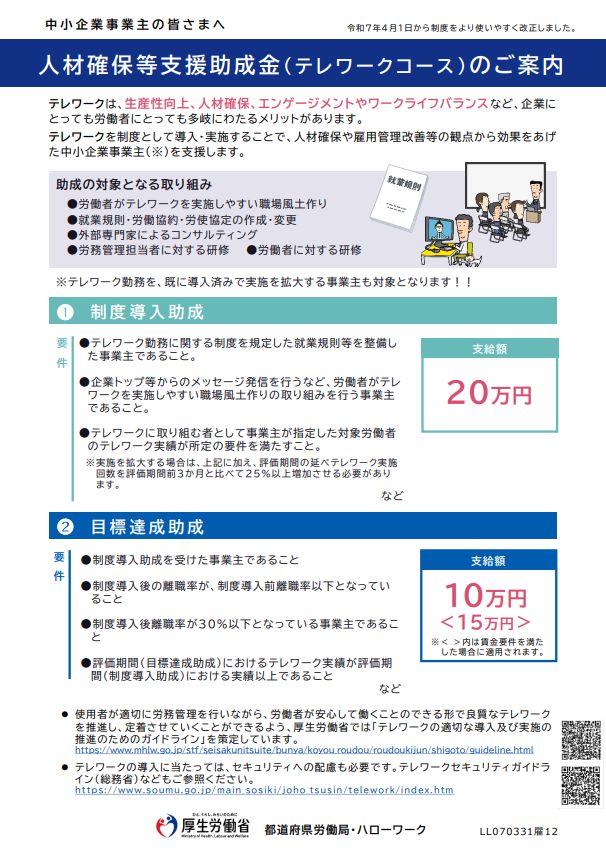 タイトル:人材確保等支援助成金(テレワークコース)のご案内発行者:厚生労働省・都道府県労働局・ハローワーク発行時期:2025年4月ページ数:2ページ概要:テレワークを制度として導入・実施することで、人材確保や雇用管理改善 […]