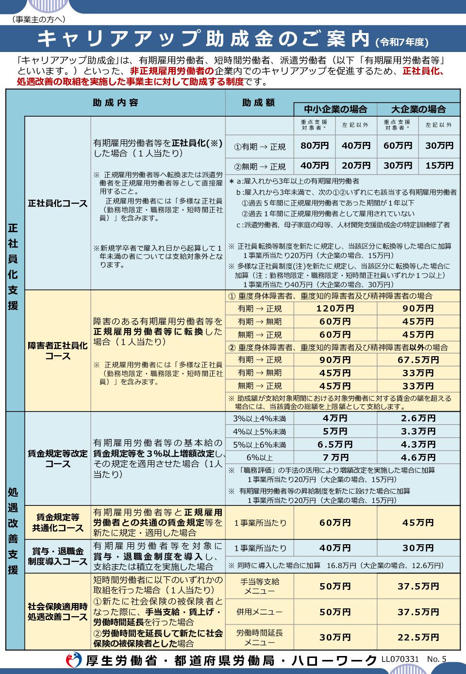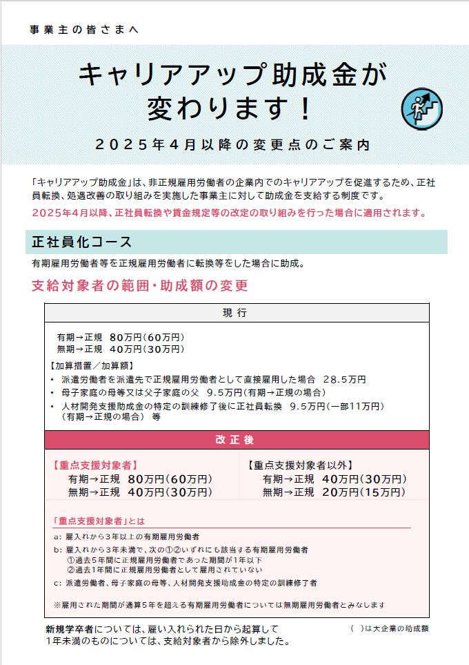 タイトル:キャリアアップ助成金が変わります!2025年4月以降の変更点のご案内 発行者:厚生労働省・都道府県労働局・ハローワーク 発行時期:2025年3月 ページ数:2ページ 概要:2025年4月以降の制度見直しによる変 […]