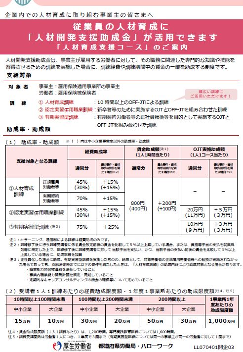 タイトル:従業員の人材育成に「人材開発支援助成金」が活用できます 「人材育成支援コース」のご案内 発行者:厚生労働省 発行時期:2025年4月 ページ数:2ページ 概要:人材開発支援助成金は、事業主が雇用する労働者に対し […]