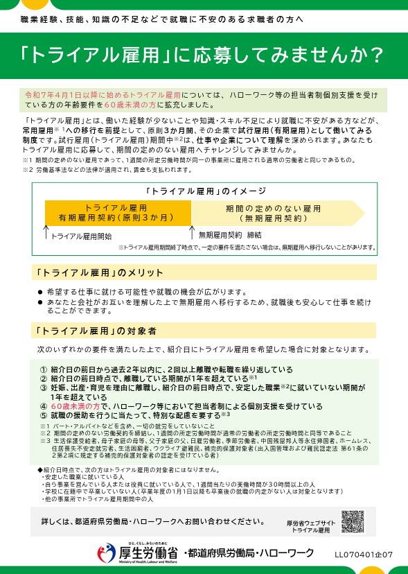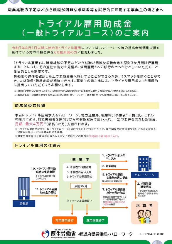 タイトル:求職者の方へ「トライアル雇用」に応募してみませんか?(2025年4月版) 発行者:厚生労働省・都道府県労働局・ハローワーク 発行時期:2025年4月 ページ数:1ページ 概要:トライアル雇用助成金の一般トライア […]
