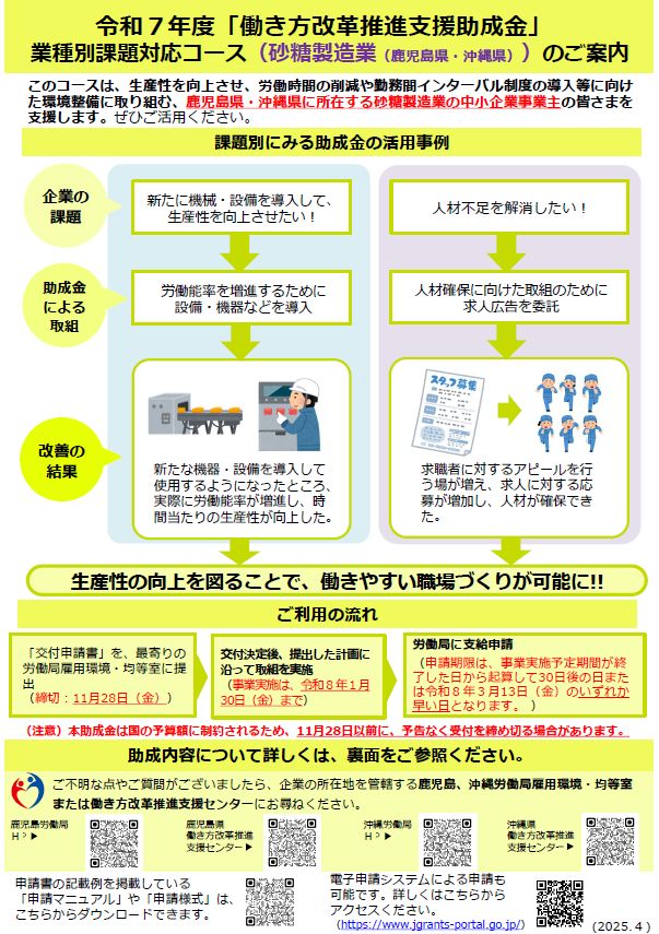 タイトル:令和7年度働き方改革推進支援助成金 業種別課題対応コース(砂糖製造業(鹿児島県・沖縄県))のご案内 発行者:厚生労働省 発行時期:2025年4月 ページ数:2ページ 概要:「働き方改革推進支援助成金」 業種別課 […]