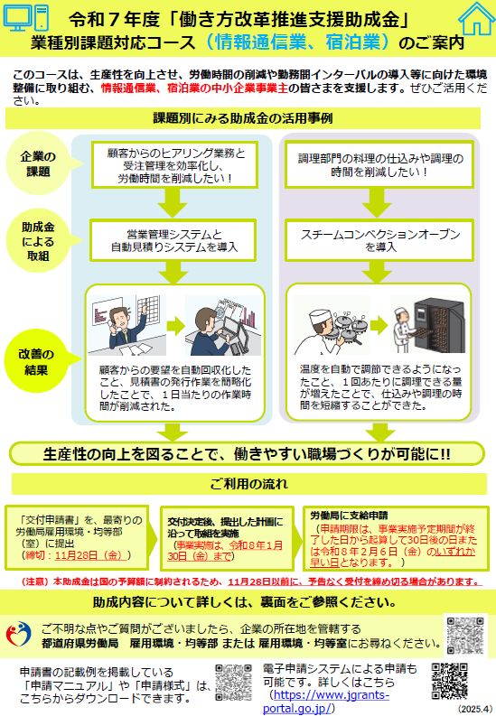 タイトル:令和7年度働き方改革推進支援助成金 業種別課題対応コース(情報通信業、宿泊業)のご案内 発行者:厚生労働省 発行時期:2025年4月 ページ数:2ページ 概要:「働き方改革推進支援助成金」 業種別課題対応コース […]