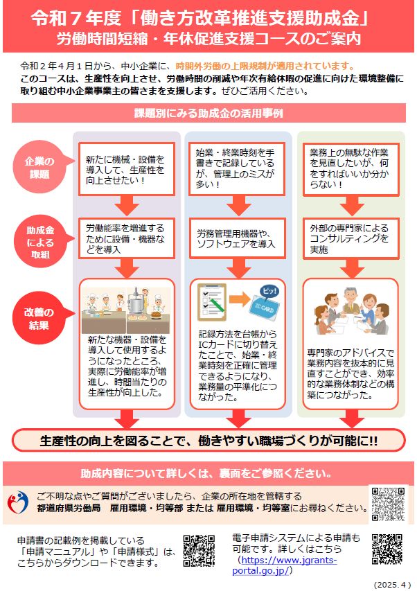 タイトル:令和7年度「働き方改革推進支援助成金」 労働時間短縮・年休促進支援コースのご案内 発行者:厚生労働省 発行時期:2025年4月 ページ数:2ページ 概要:「働き方改革推進支援助成金」 労働時間短縮・年休促進支援 […]