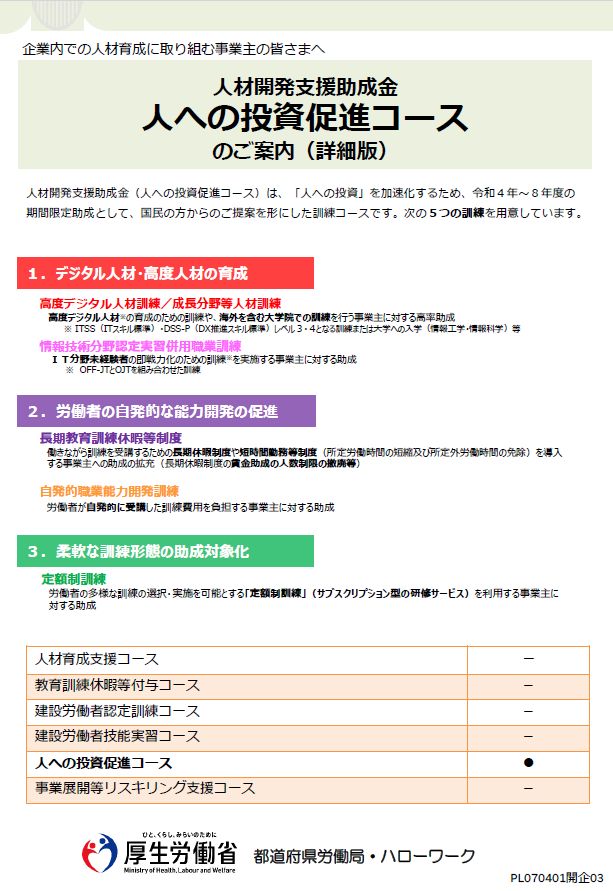 タイトル:人材開発支援助成金 人への投資促進コースのご案内(詳細版)(2025年4月版) 発行者:厚生労働省・都道府県労働局・ハローワーク 発行時期:2025年4月 ページ数:67ページ 概要:人材開発支援助成金の人への […]