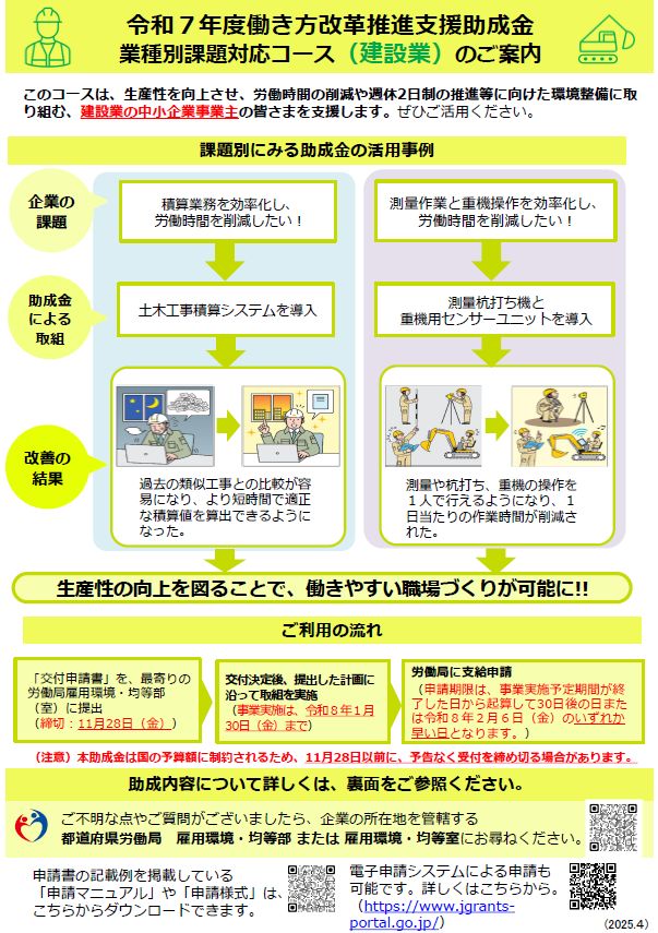 タイトル:令和7年度働き方改革推進支援助成金 業種別課題対応コース(建設業)のご案内 発行者:厚生労働省 発行時期:2025年4月 ページ数:2ページ 概要:「働き方改革推進支援助成金」 業種別課題対応コース(建設業)に […]