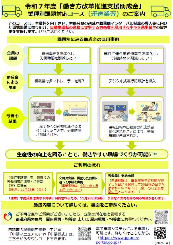 タイトル:令和7年度働き方改革推進支援助成金 業種別課題対応コース(運送業等)のご案内 発行者:厚生労働省 発行時期:2025年4月 ページ数:2ページ 概要:「働き方改革推進支援助成金」 業種別課題対応コース(運送業等 […]