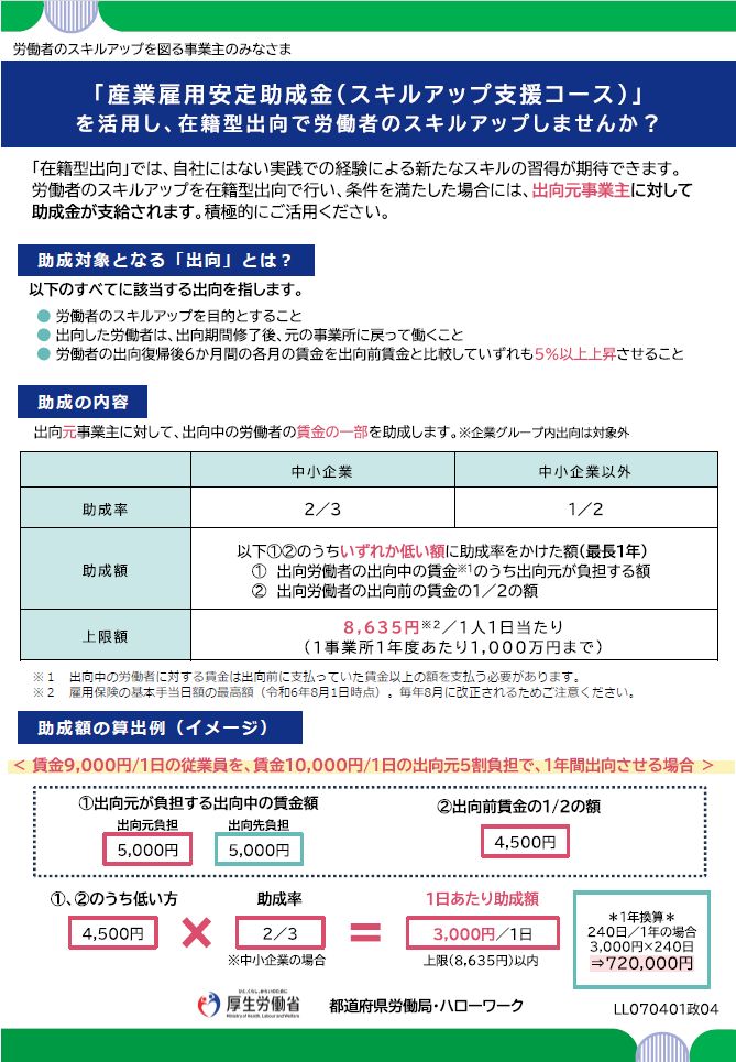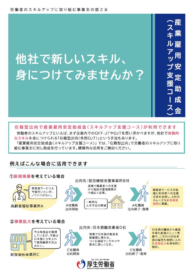 タイトル:他社で新しいスキル、身につけてみませんか?発行者:厚生労働省発行時期:2025年1月ページ数:2ページ概要:在籍型出向で産業雇用安定助成金(スキルアップ支援コース)のが利用できることを案内したリーフレット Do […]
