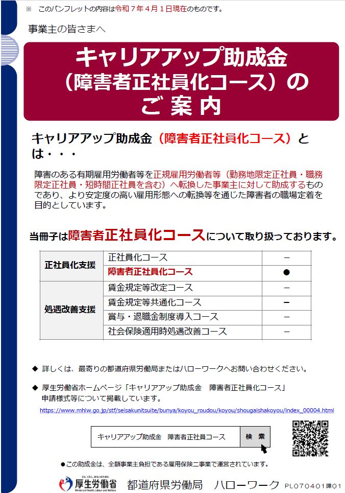タイトル:キャリアアップ助成金(障害者正社員化コース)のご案内(2025年4月版) 発行者:厚生労働省・都道府県労働局・ハローワーク 発行時期:2025年4月1日 ページ数:22ページ 概要:キャリアアップ助成金(障害者 […]