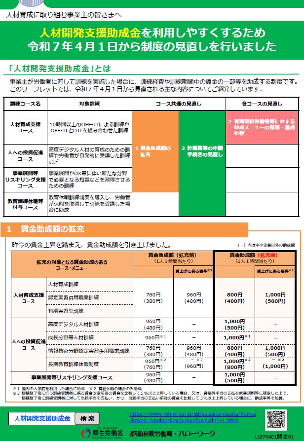 タイトル:人材開発支援助成金を利用しやすくするため、令和7年4月1日から制度の見直しを行いました(2025年4月版) 発行者:厚生労働省・都道府県労働局・ハローワーク 発行時期:2025年4月 ページ数:4ページ 概要: […]