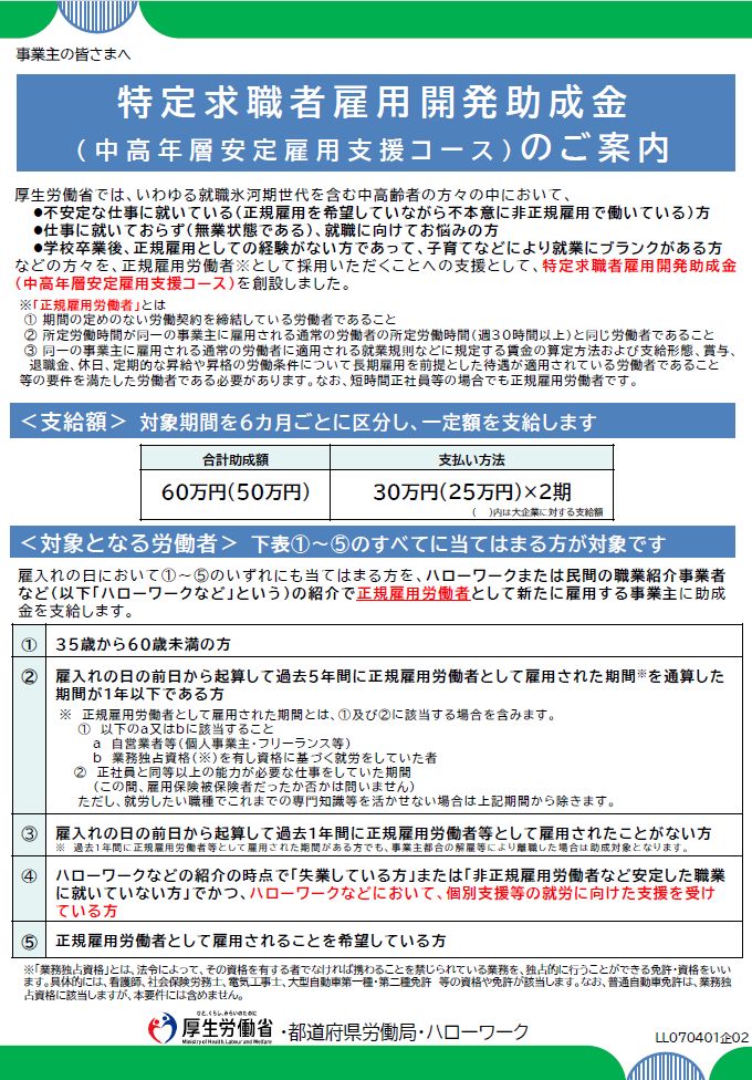 タイトル:特定求職者雇用開発助成金(中高年層安定雇用支援コース)のご案内(2025年4月版) 発行者:厚生労働省・都道府県労働局・ハローワーク 発行時期:2025年4月 ページ数:2ページ 概要:特定求職者雇用開発助成金 […]