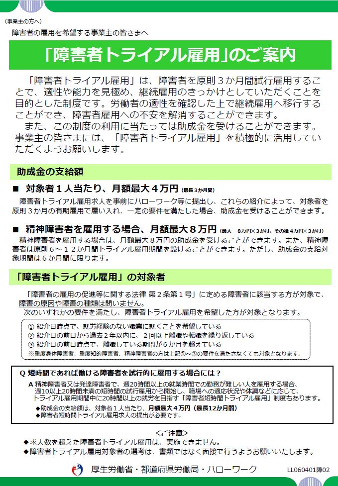 タイトル:「障害者トライアル雇用」のご案内(2025年4月版) 発行者:厚生労働省・都道府県労働局・ハローワーク 発行時期:2025年4月 ページ数:4ページ 概要:トライアル雇用助成金の障害者トライアルコースを案内した […]