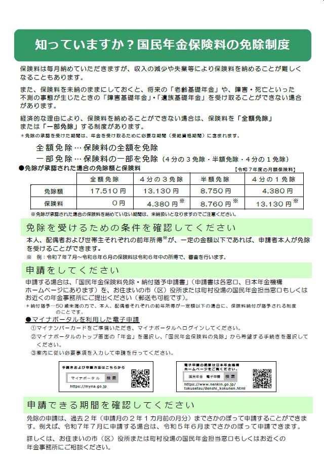 タイトル:知っていますか?国民年金保険料の免除制度発行者:日本年金機構発行時期:2025年7月ページ数:2ページ概要:このリーフレットは、国民年金保険料の免除制度について解説している。経済的理由により保険料を納められない […]