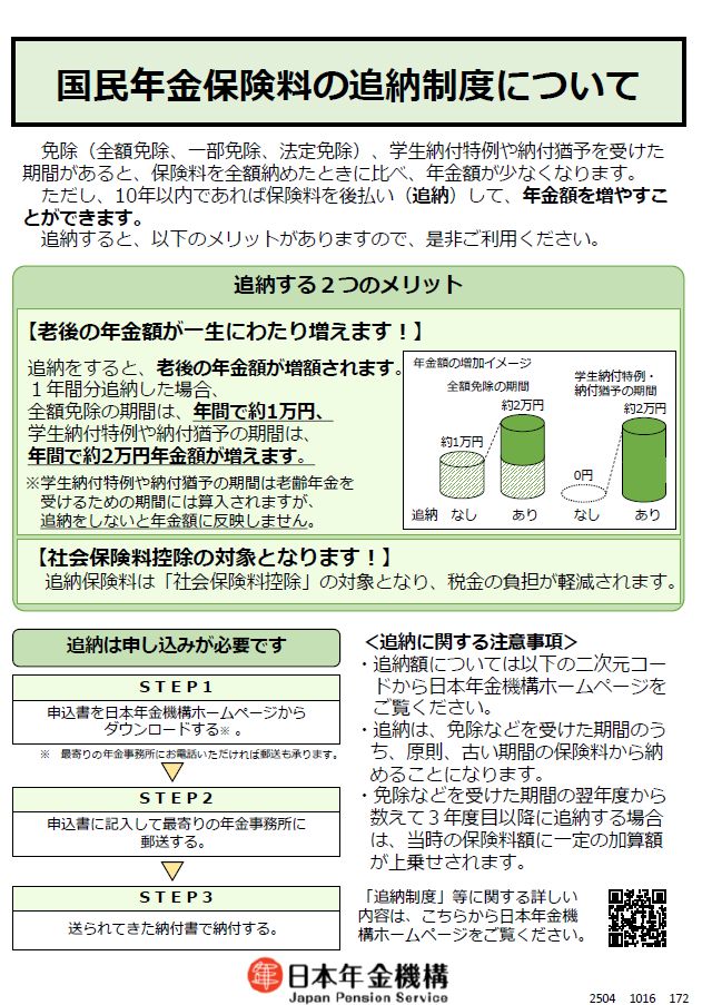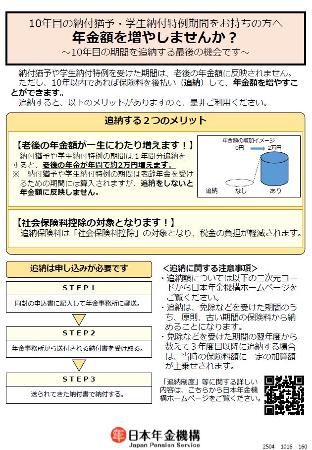 タイトル:10年目の納付猶予・学生納付特例期間をお持ちの方へ 年金額を増やしませんか?発行者:日本年金機構発行時期:2025年8月ページ数:1ページ概要:このリーフレットは、10年目の納付猶予や学生納付特例を受けた方に向 […]