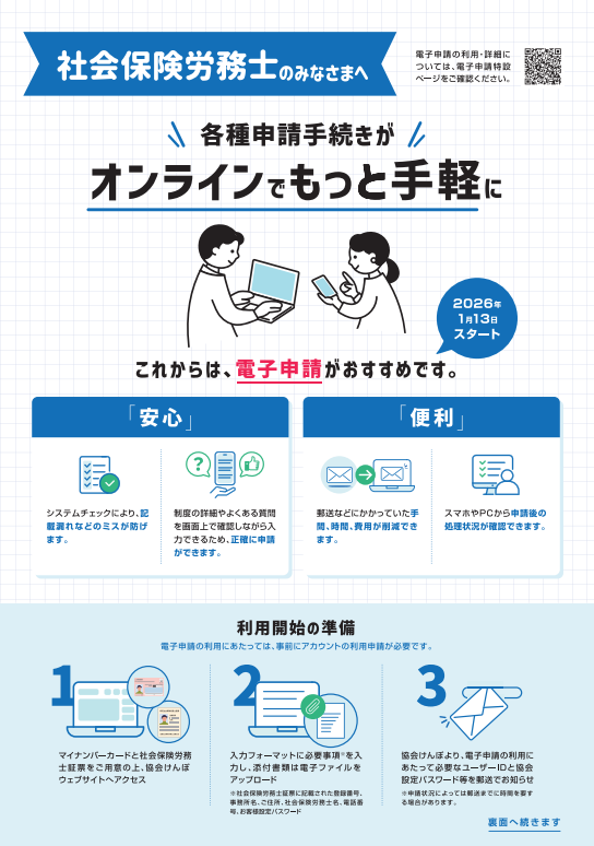 タイトル:社会保険労務士のみなさまへ 各種申請手続きがオンラインでもっと手軽に発行者:全国健康保険協会(協会けんぽ)発行時期:2025年9月ページ数:2ページ概要:このリーフレットは、2026年1月より開始される協会けん […]