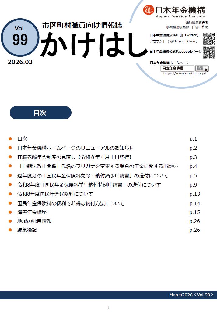 タイトル:市区町村国民年金担当者向け情報誌「かけはし」第99号 発行者:日本年金機構 発行時期:2026年3月 ページ数:26ページ 概要:日本年金機構の保険業務に係る取り組みと連絡事項等を掲載したもの。主な内容は以下の […]