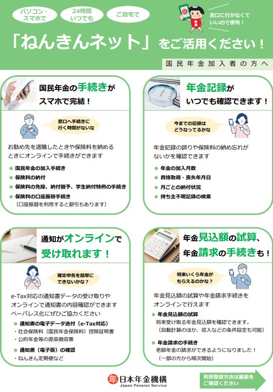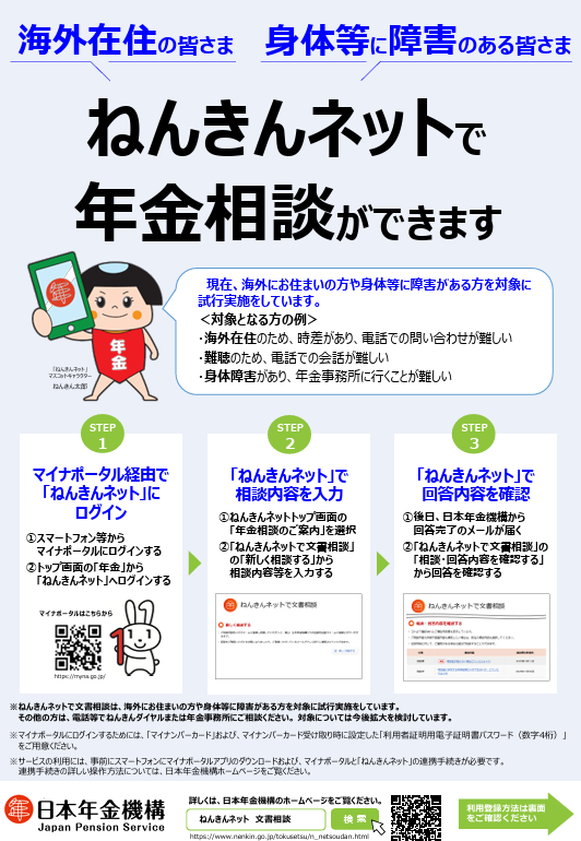 タイトル:海外在住の皆さま 身体等に障害のある皆さま ねんきんネットで年金相談ができます 発行者:国民年金機構発行時期:2025年3月ページ数:2ページ概要:海外在住の方や身体等に障害のある方に向けて、ねんきんネットで年 […]